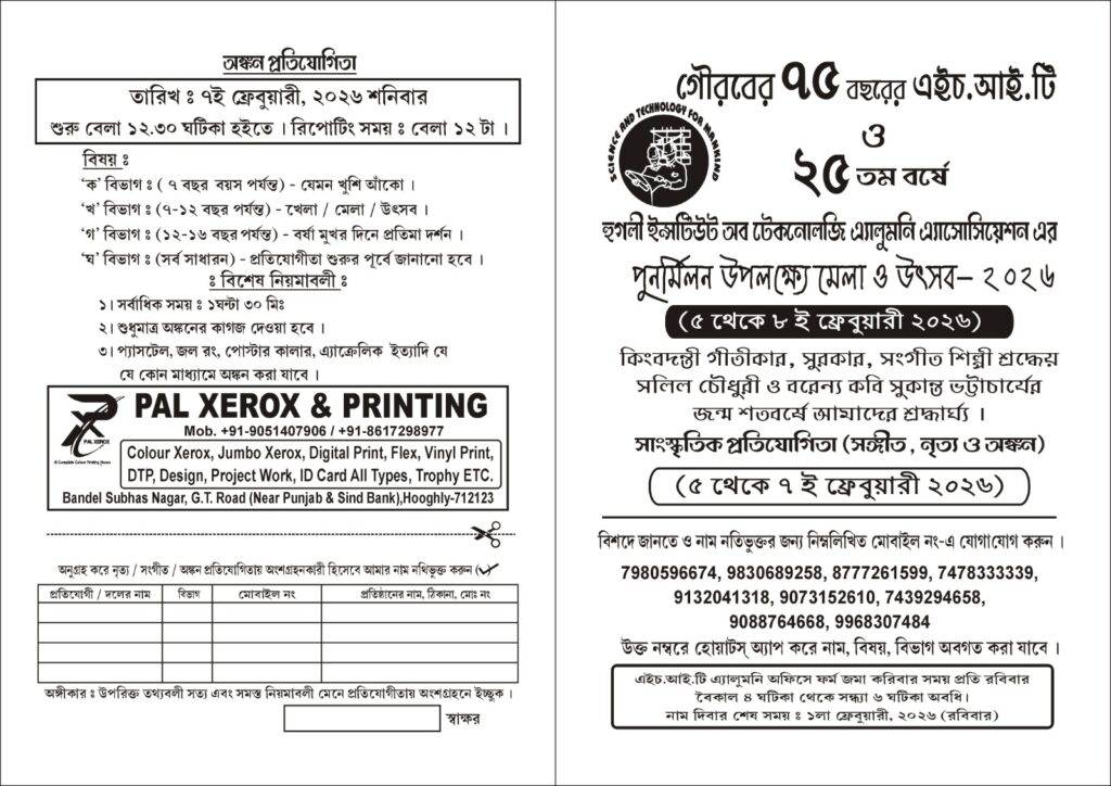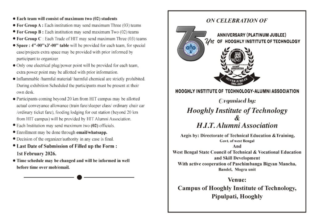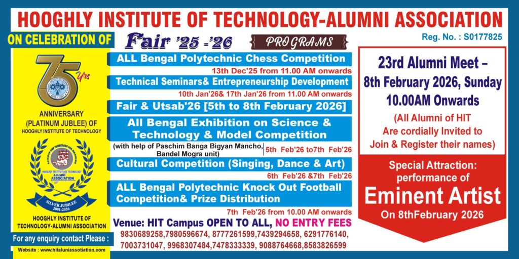 Celebrating Fair ’25–’26 On the grand celebration of the 75 Years Anniversary (Platinum Jubilee) of Hooghly Institute of Technology and the Silver Jubilee (2001–2026) of the Hooghly Institute of Technology – Alumni Association. Programs & Activities All Bengal Polytechnic Chess Competition 13th December 2025 from 11.00 AM onwards Technical Seminars & Entrepreneurship Development 10th January […]
